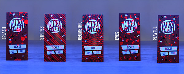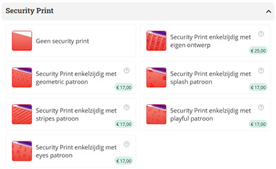 We hebben een aantal patronen aangemaakt die we over je ontwerp heen kunnen drukken. Dan moet je zelf enkel nog het full-color ontwerp uploaden dat je wilt laten drukken. Wij gaan dan zorgen dat het gekozen patroon hier nog overheen gezet wordt op de voorkant. Op de achterkant van je tickets komt geen security print, ook niet als je voor 4/4 bedrukking hebt gekozen.
