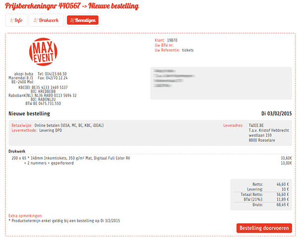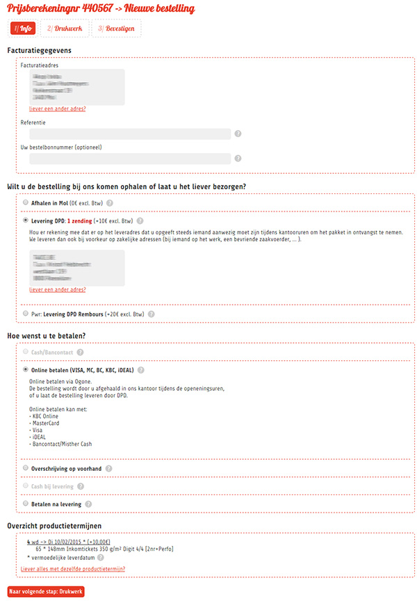 De laatste tab vat nog een keer alles samen met betrekking tot je bestelling. Als je hier klikt op 'bestelling doorvoeren', dan wordt de bestelling naar onze interne dienst doorgestuurd zodat we met je drukwerk aan de slag kunnen. Koos je voor 'online betaling', dan krijg je ondertussen nog een pop-up venster met de uitnodiging om online te gaan betalen. Lukt dit om 1 of andere reden niet, je kan nadien ook steeds nog via je account de bestelling gaan betalen. De knop om te betalen blijft bij de bestelling zichtbaar staan in je account, zolang we er nog geen betaling voor ontvangen hebben.