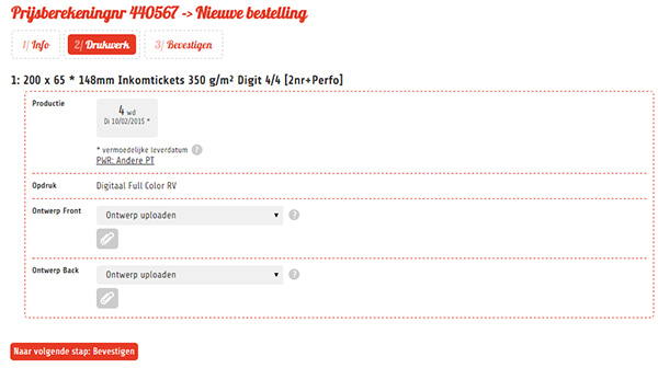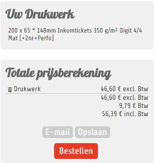 Na het toevoegen van de tickets, kan ik dus naar een andere product-pagina gaan zoals flyers of affiches en ook daarvan artikel bij aan de prijsberekening voegen. Zo vul ik mijn prijsberekening tot alle items toegevoegd zijn. Op deze manier kan je de prijsberekening gaan bewaren, zodat de bestelling eventueel later kan vervolledigen, je kan de prijsberekening ook via e-mail laten toesturen, of je kan de prijsberekening afronden en klikken op 'bestellen'.