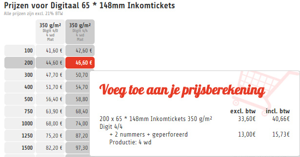 Als voorbeeld wil ik 200 tickets bestellen, met dubbele nummering en met een perforatiestrook. Ik klik dan in de kolom waar '4/4' in de omschrijving staat, want ik wil de tickets recto-verso gedrukt hebben. Van zodra je met de muisaanwijzer over de prijzen komt, verschijnt er een informatie-venstertje met in detail wat er in deze prijs inbegrepen zit. Door te klikken, plaats je dit drukwerk bij in je prijsberekening.