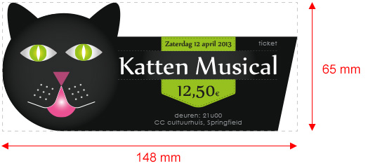We zijn vertrokken vanaf een standaard ticket formaat van 65 * 148mm. Vul dat formaat (inclusief de afloop) dan ook best volledig met een achtergrondkleur of -afbeelding. Bepaalde elementen die je zeker tot op de rand van het kaartje zou willen zien verschijnen, teken die ook door tot voorbij de eigenlijke snijvorm. Dit moet je doen, om eventuele afwijkingen op te vangen.