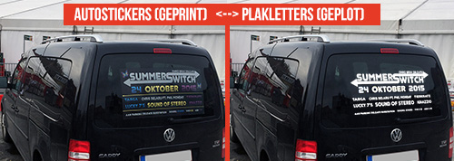 Het gaat bij beide soorten stickers om PVC stickers die geschikt zijn voor buitengebruik, maar ze worden met verschillende machines gemaakt. De geprinte autostickers worden steeds op witte stickervellen gedrukt, jouw ontwerp zorgt daarbij voor kleur op de sticker. Bij de plakletters vertrekken we van gekleurde stickervellen en daar wordt jouw ontwerp uitgesneden. Na het snijden, wordt het overtollige van het vel verwijderd en blijft enkel je ontwerp over op de backing. Hierover brengen we een applicatietape aan (soort van grote schilderstape) waarmee je jouw sticker makkelijk van de backing gaat kunnen halen zodat je hem kan gaan plakken.