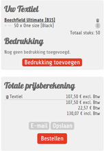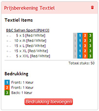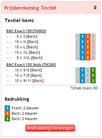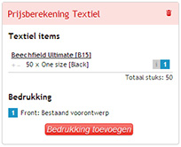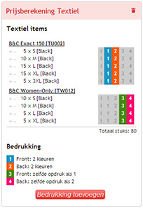 De prijsberekening zou nu correct moeten zijn opgemaakt, volgens het ontwerp dat je in gedachten had. Klik op bestellen om in volgende schermen de bestelling verder af te handelen. Eén van de stappen zal zijn om de namen op te geven die op de t-shirts moeten gedrukt worden.