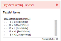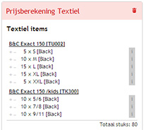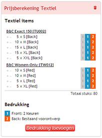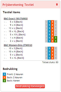 Van zodra je een bedrukking definieert zoals we hierboven beschrijven, zal die bedrukking automatisch toegekend worden aan alle textiel in je overzicht. Dat merk je doordat achter de regels de cijfertjes actief staan, zoals en .