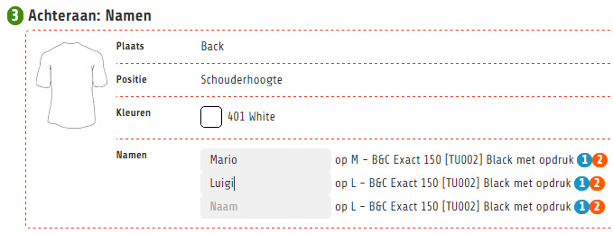 2. Bedrukking van een logo vooraan en achteraan maar op enkele t-shirts moet ook een naam gedrukt worden.