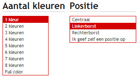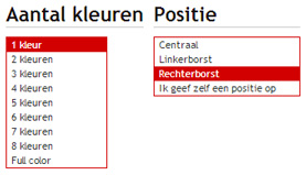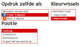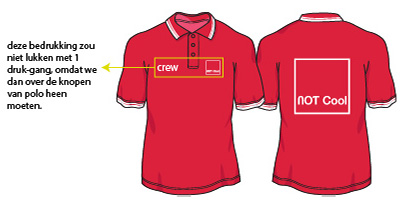 We willen ons logo op de rug gedrukt krijgen. Ook op de linkerborst komt het logo en op de rechterborst mag 'crew' gedrukt worden. Op t-shirts kunnen linker- en rechterborst in 1 druk-gang gezet worden, maar bij polo's bijvoorbeeld zitten knopen in de weg, waardoor we zo'n bedrukking in 2 keer zouden moeten uitvoeren. Je moet dan voor zowel linker- als rechterborst een bedrukking gaan definiëren.